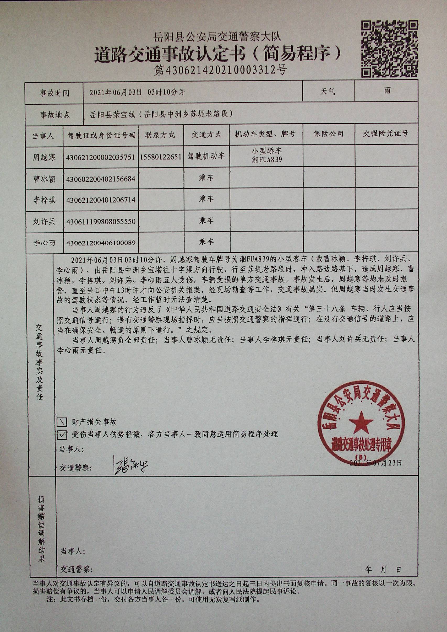 此交通事故立案後,辦案民警依法對肇事司機周越寒及車上乘客進行了傳喚詢問,均未發現其它違法行為證據,並將調查情況及時與此車輛的投保公司太平洋保險公司嶽陽縣分公司業務員進行了通報溝通。在傷者家屬及車主吳帆宇的正當要求下,2021年7月23日,交警大隊秩序中隊對此事故進行了實事求是的單方事故責任認定。