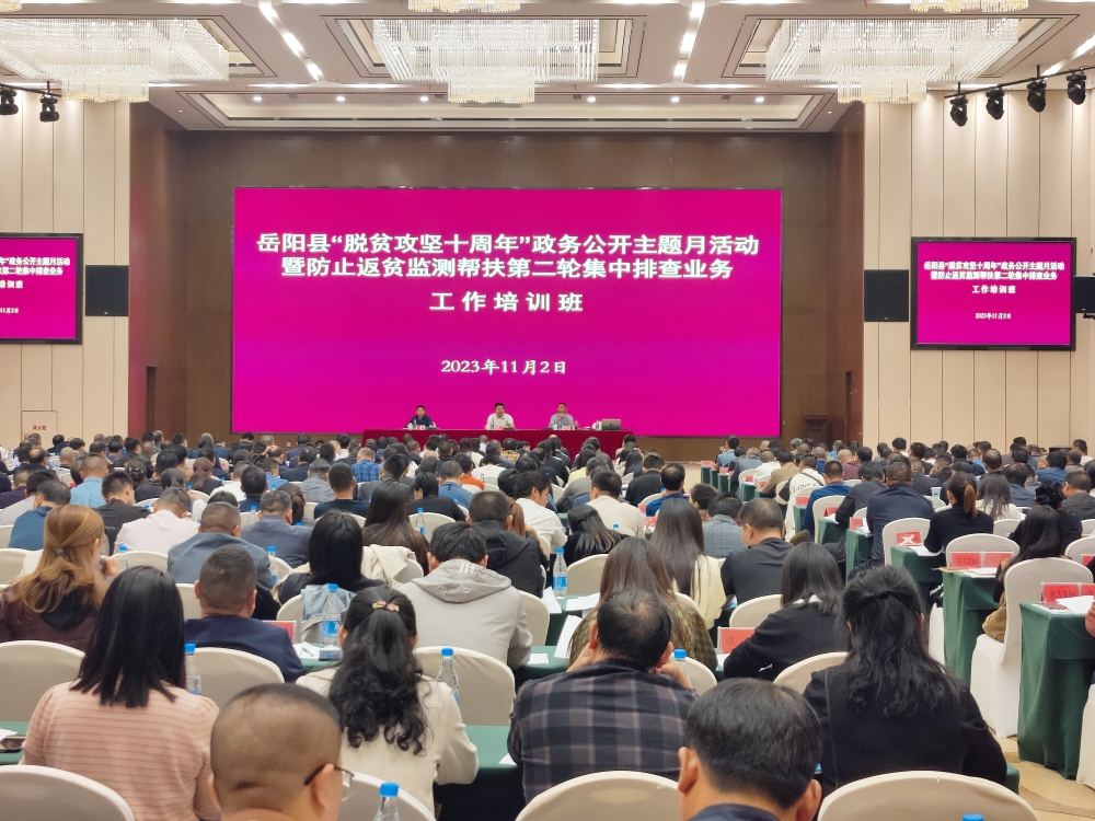 11月2日,嶽陽縣舉辦“脫貧攻堅十周年”政務公開主題月活動暨防止返貧監測幫扶第二輪集中排查業務工作培訓班。縣委常委、副縣長賀立出席並講話,縣鄉村振興局黨組書記、局長劉滔主持。縣鄉村振興局、縣駐村辦全體幹部,各鄉鎮分管、專幹、信息員,市縣派駐村工作隊,村分管負責人共430人參加。