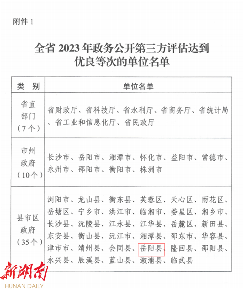 湖南日報·新湖南客戶端2月19日訊(通訊員 續鼎)近日,湖南省人民政府辦公廳印發《湖南省人民政府辦公廳關於全省2023年政務公開第三方評估情況的通報》(湘政辦函〔2024〕5號),通報公布了評估達到優良等次的單位名單,全省7個省直部門、10個市州政府、35個縣市區政府政務公開工作獲表彰。其中,嶽陽縣評估成績達到優良等次。這是嶽陽縣在獲評“五年一度”湖南省“政務公開工作先進單位”後,再次獲得全省先進,是省政府對嶽陽縣政務公開工作的再次肯定和表彰。